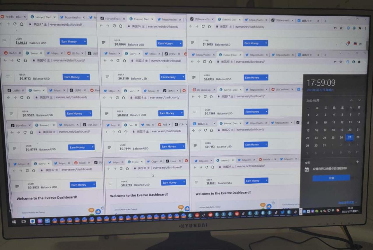 单窗口0.2-0.5美元左右(看人工投入),这里以平均数值0.25做计算。一台电脑50窗口一个月的总计产出:50×0.25x30x7=2625元