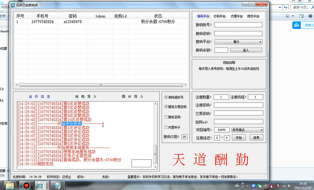 项目主要是通过用软件去自动签到任务去获得每日积分,每周五可以抢购30话费,基本就是无脑操作,登录上以后,一个号1-2分钟,挂机就完事了。脚本支持批量养号抢兑功能 ,多号操作抢购中奖概率更高